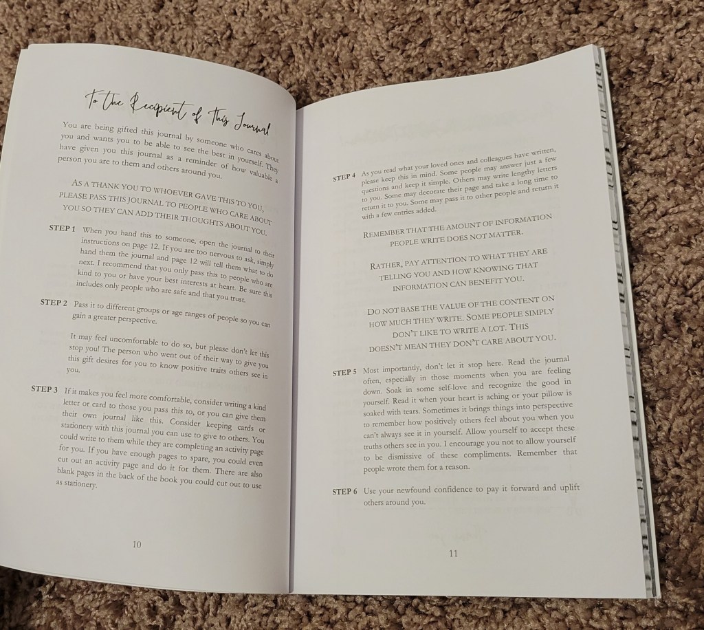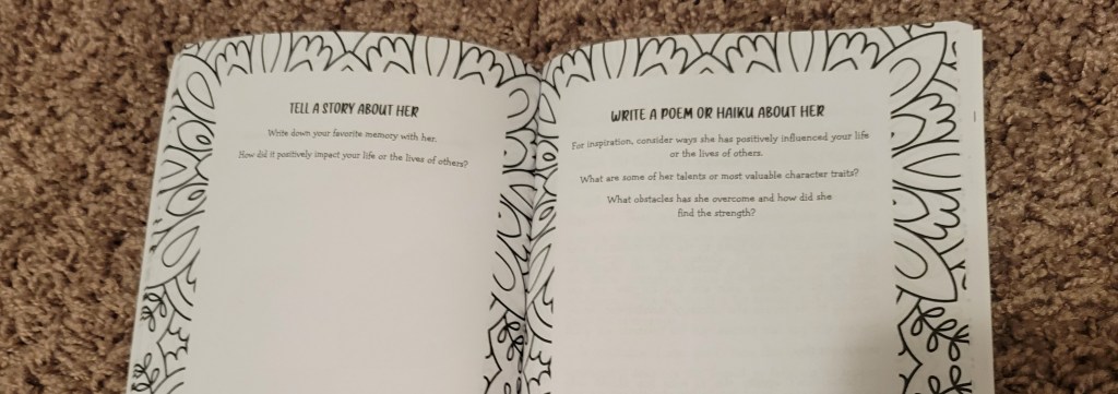 I’ve taken some photos to show you all what the insides of these books look like, to give you a brief idea without spoiling the joy of looking through the books yourself. You all know I usually write some pretty negative book reviews–this is one of the few I’ve written that I only have positive things to say! I would recommend any of these journals to someone wanting a quick and easy gift for a friend or family member, or even for themselves if they’re looking to get loved ones’ opinions or start a self-care journal for yourself.
